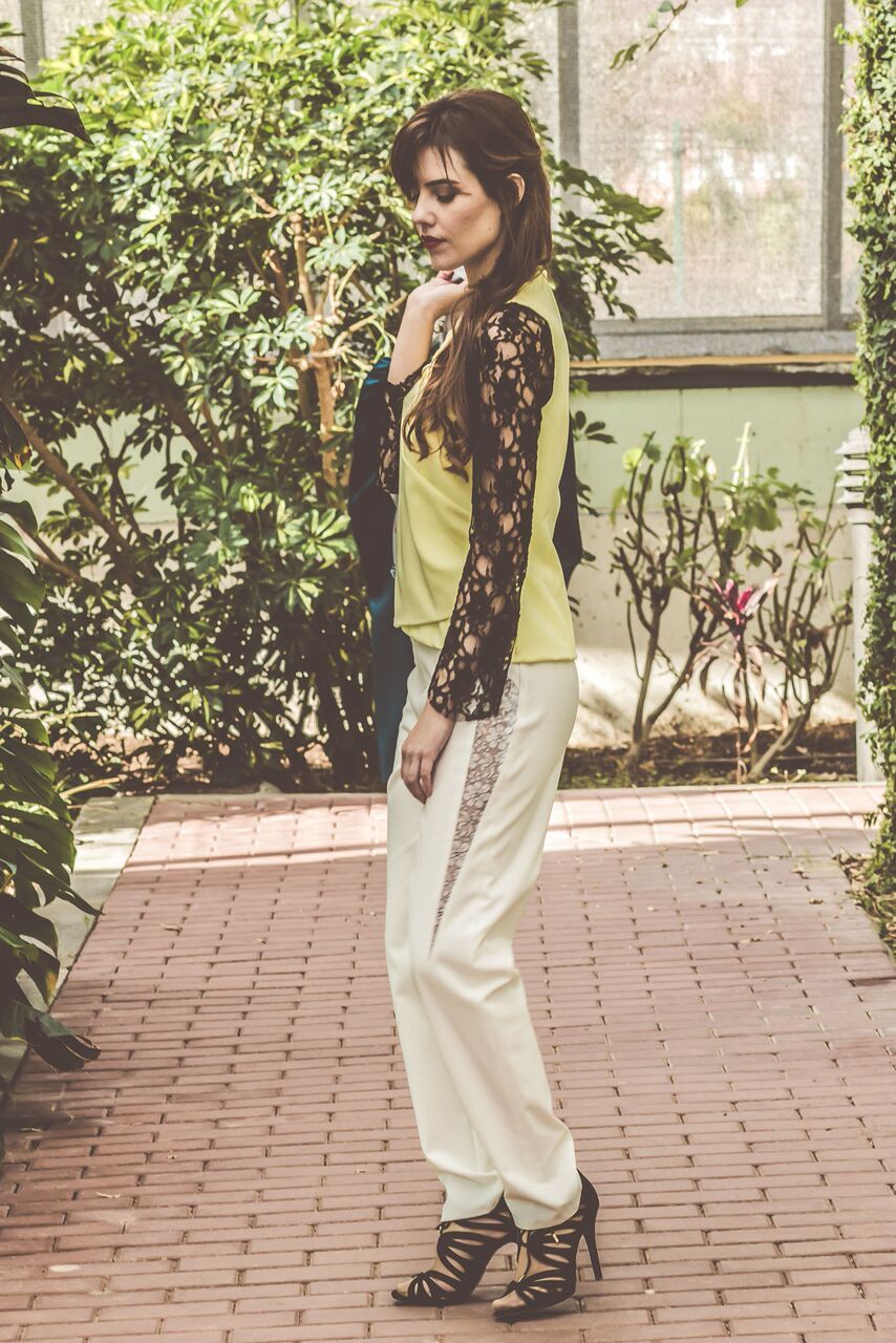 Blusa con escote en uve cruzado adornado con cintas cruzadas. Mangas raglán en encaje.