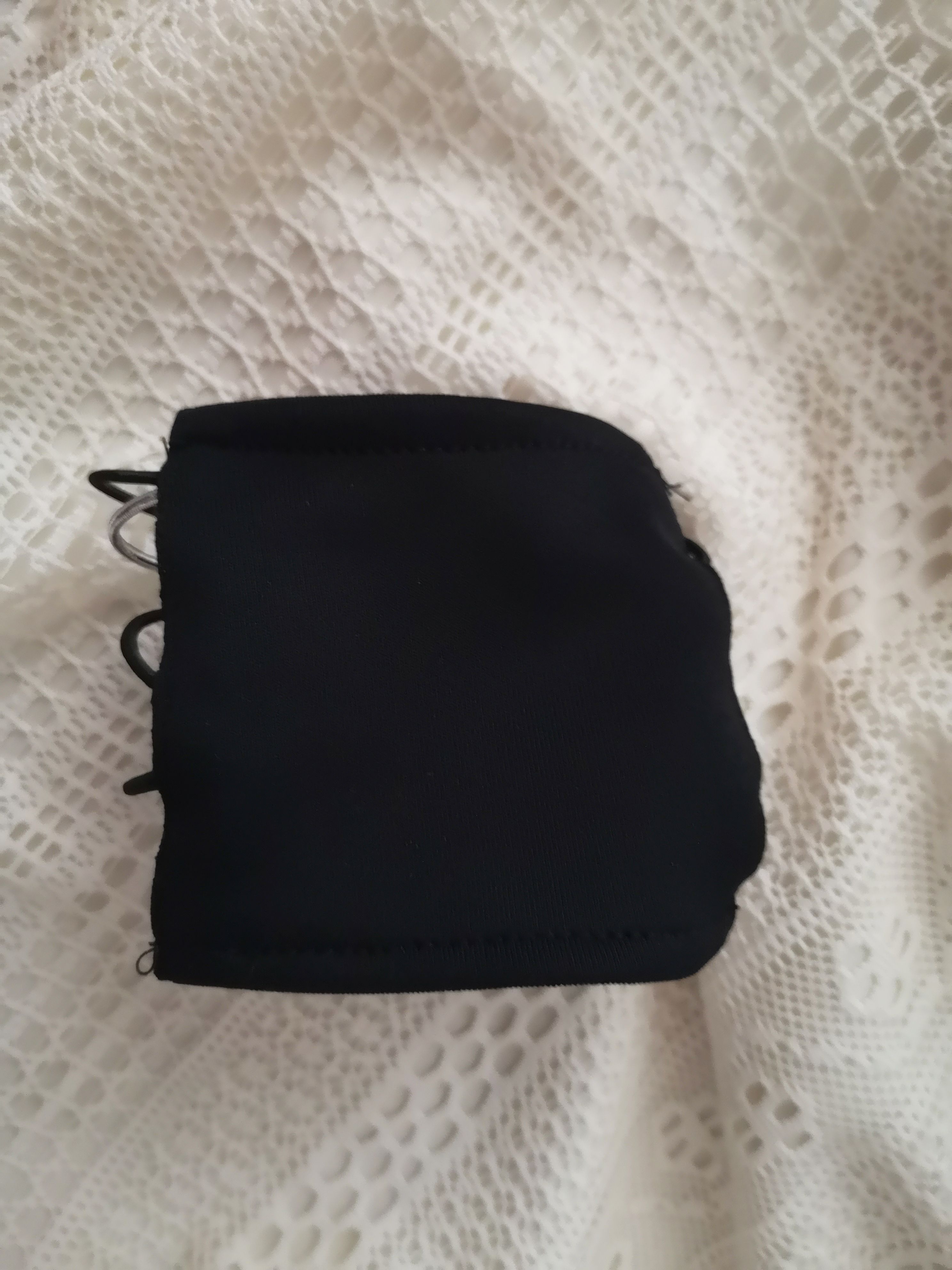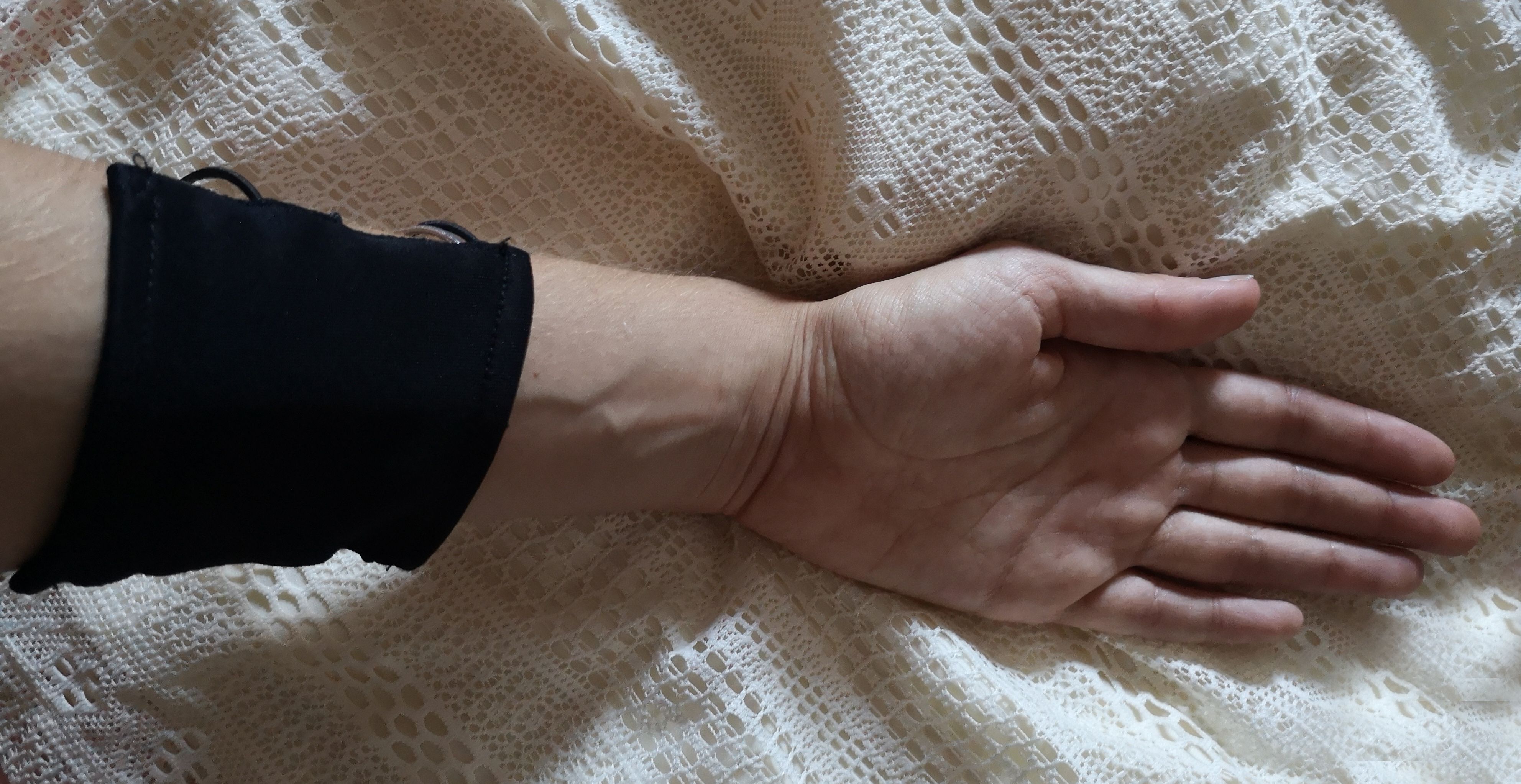 Brazalete de punto con cintas de adorno en plata y negro y flores de raso rosas.