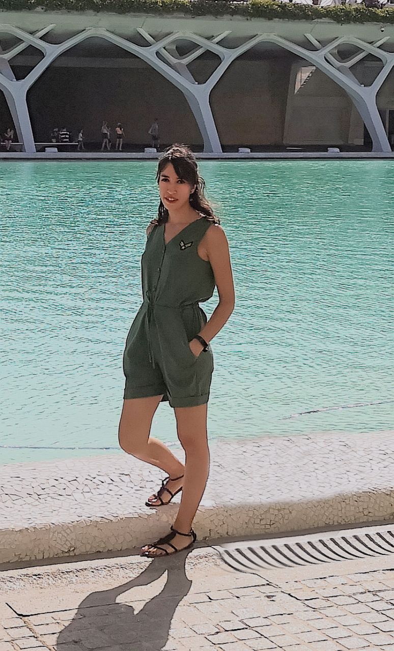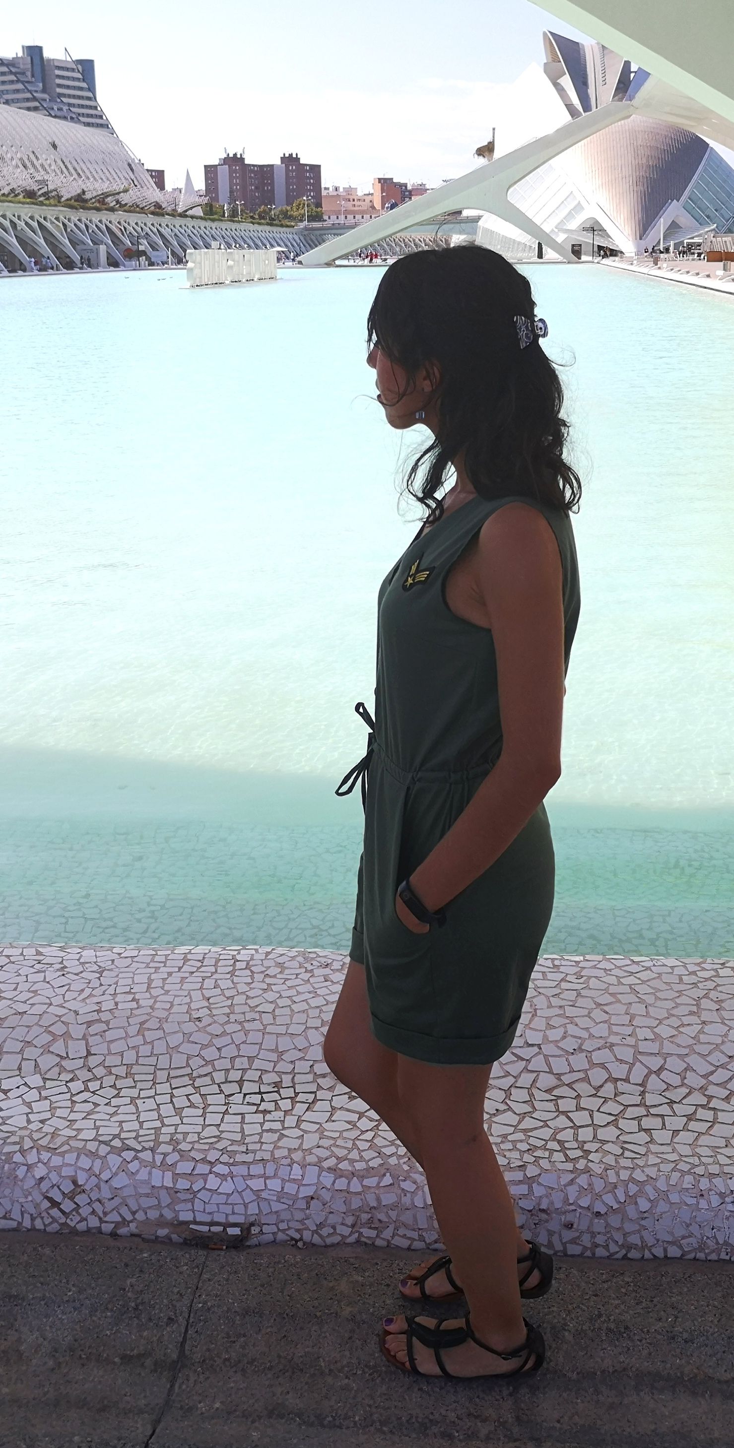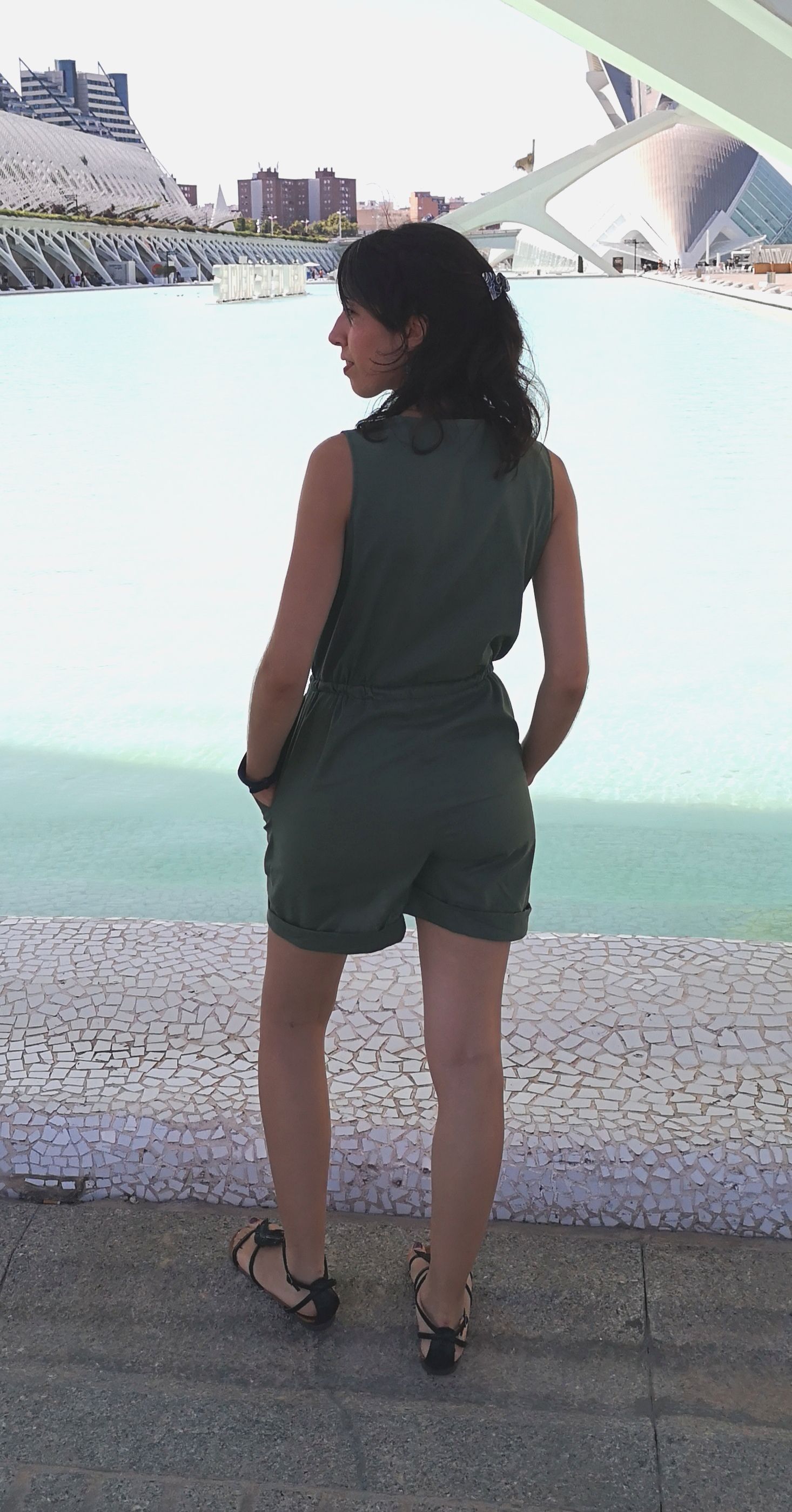 Mono corto estilo militar. Lleva un parche de adorno en el pecho y un cordón para ajustar a la cintura.
