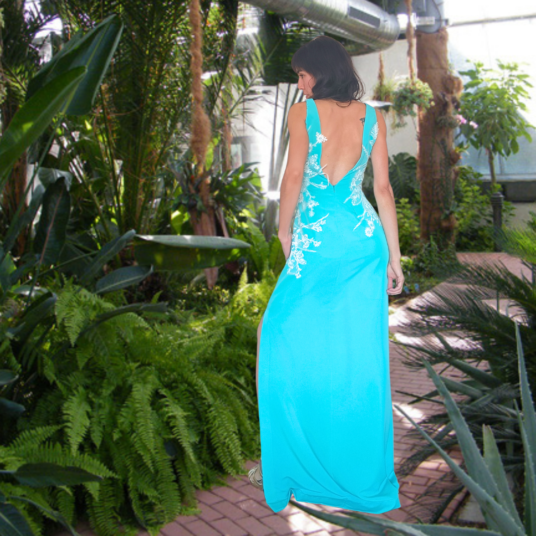 Este vestido largo turquesa es la elección perfecta para quienes buscan destacar con un estilo elegante y atrevido. Su escote en V en la espalda aporta un toque audaz, mientras que los detalles de encaje crudo en los costados añaden sofisticación y delicadeza.